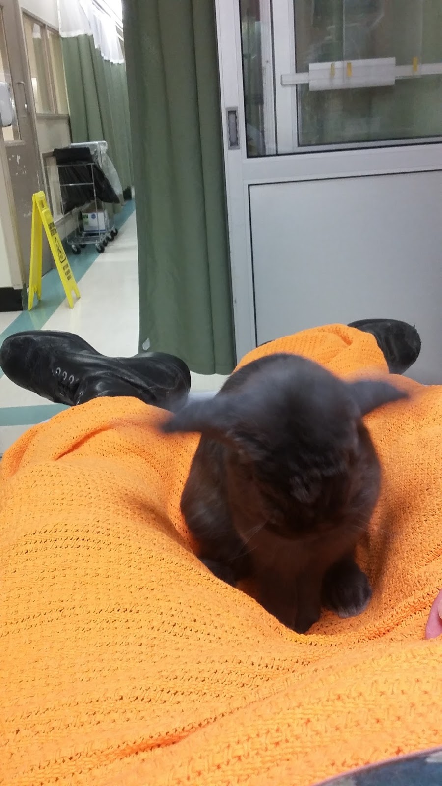 Once we were released from the hospital we took a taxi up to granty Flo's place, we were going to stay there overnight and come home Sunday morning. But daddy had a thought, he decided to see how much it would cost to get a taxi back to our place, WAY to much for a regular taxi. So daddy tried to see how much it would cost to take an Uber car back, it was a LOT cheaper. After a discussion with granty Flo about the cost, it was decided that me and daddy would order an Uber car to take us home. We got home just after 1230 am (we left home before 1000am Saturday morning, over 14 hours away from home). When daddy put me back into my pen I had a drink, used my litter box, then flopped and slept right through until late morning. I was so fast asleep that I missed getting bedtime treats.